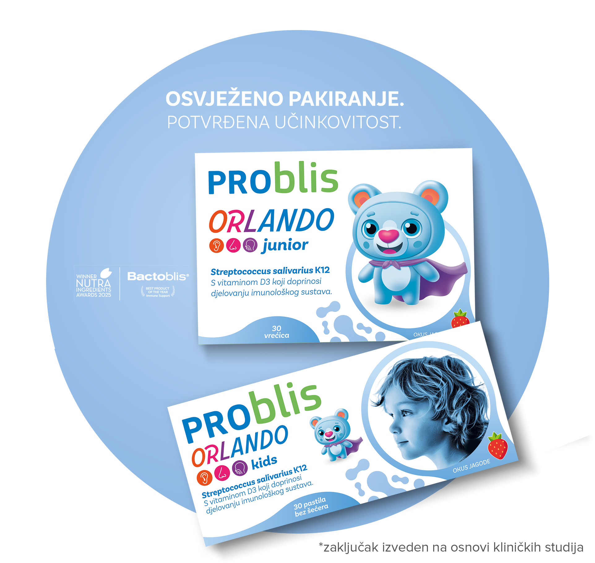 Dodatak prehrani za djecu koji sadrži premium bakterijski soj Streptococcus salivarius K12 te vitamin D3 za manje infekcija* uha, grla i nosa.