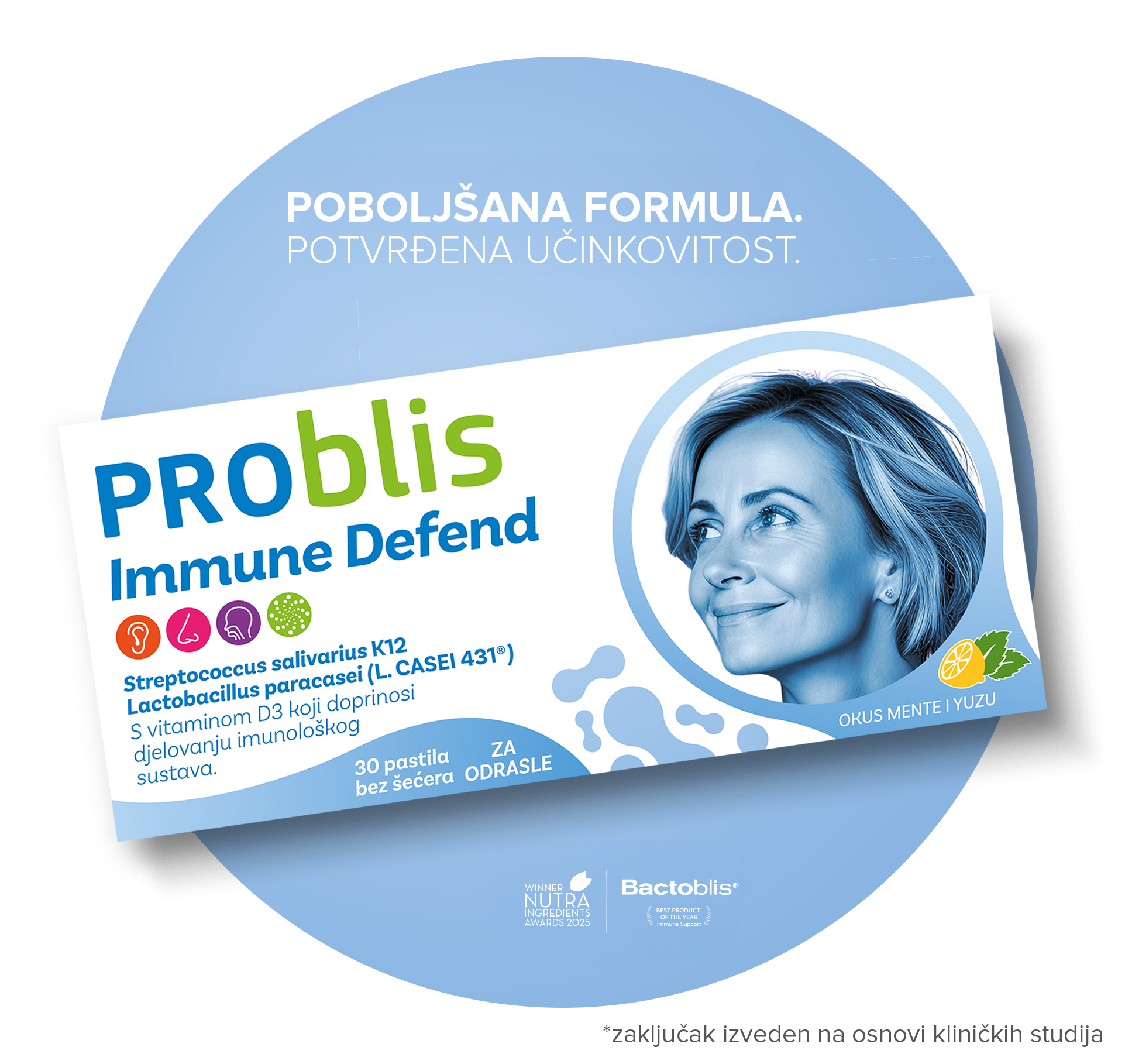 Prvi dodatak prehrani na tržištu koji sadrži bakterijski soj Streptococcus salivarius K12 i L. CASEI 431®. PROblis Immune Defend pruža sinergijsko djelovanje klinički dokazanih, premium bakterijskih sojeva za manje respiratornih infekcija odraslih.